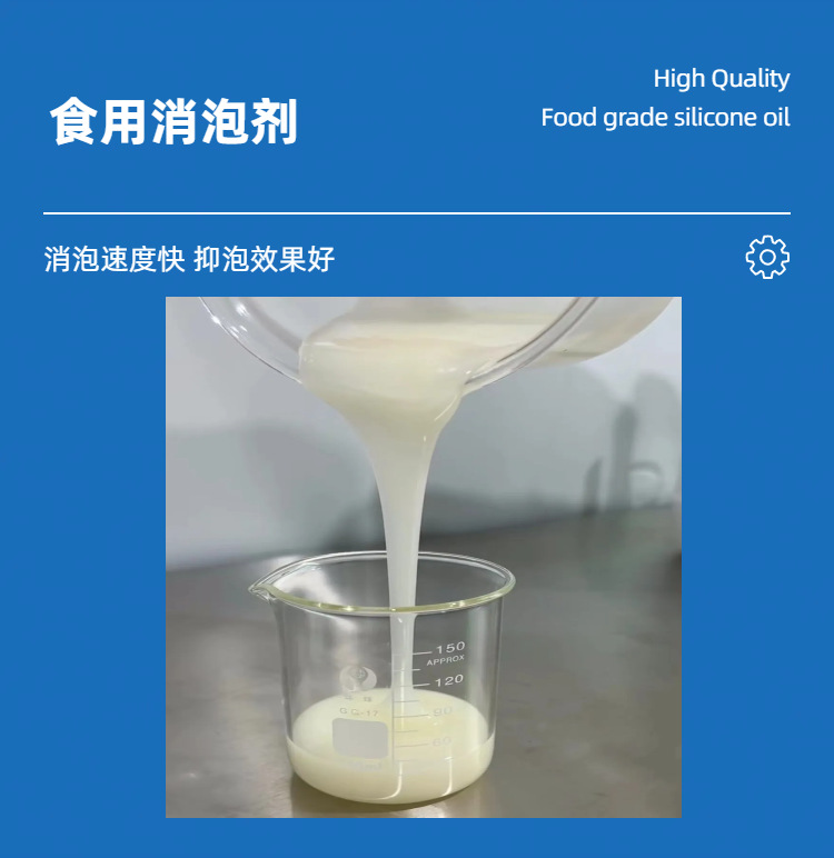 液體消泡劑(乳化硅油)為乳白色粘稠液體,無味,化學(xué)性能穩(wěn)定,在常溫和加熱狀態(tài)下均有良好消泡效果。液體消泡劑(乳化硅油)消泡速度快、抑泡時(shí)間長,無固體不溶物,易于分散,不影響食品原有的風(fēng)味,不改變物料的性質(zhì)和狀態(tài),耐溫性能好,使用方便.